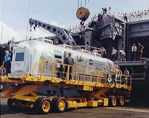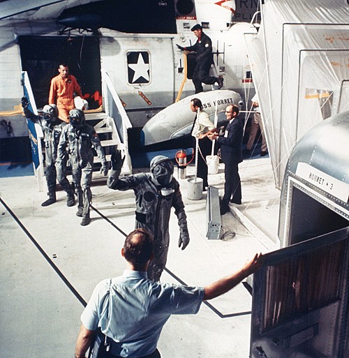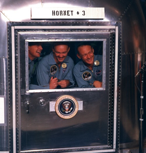 Apollo 11 astronauts arrive aboard the USS Hornet to go